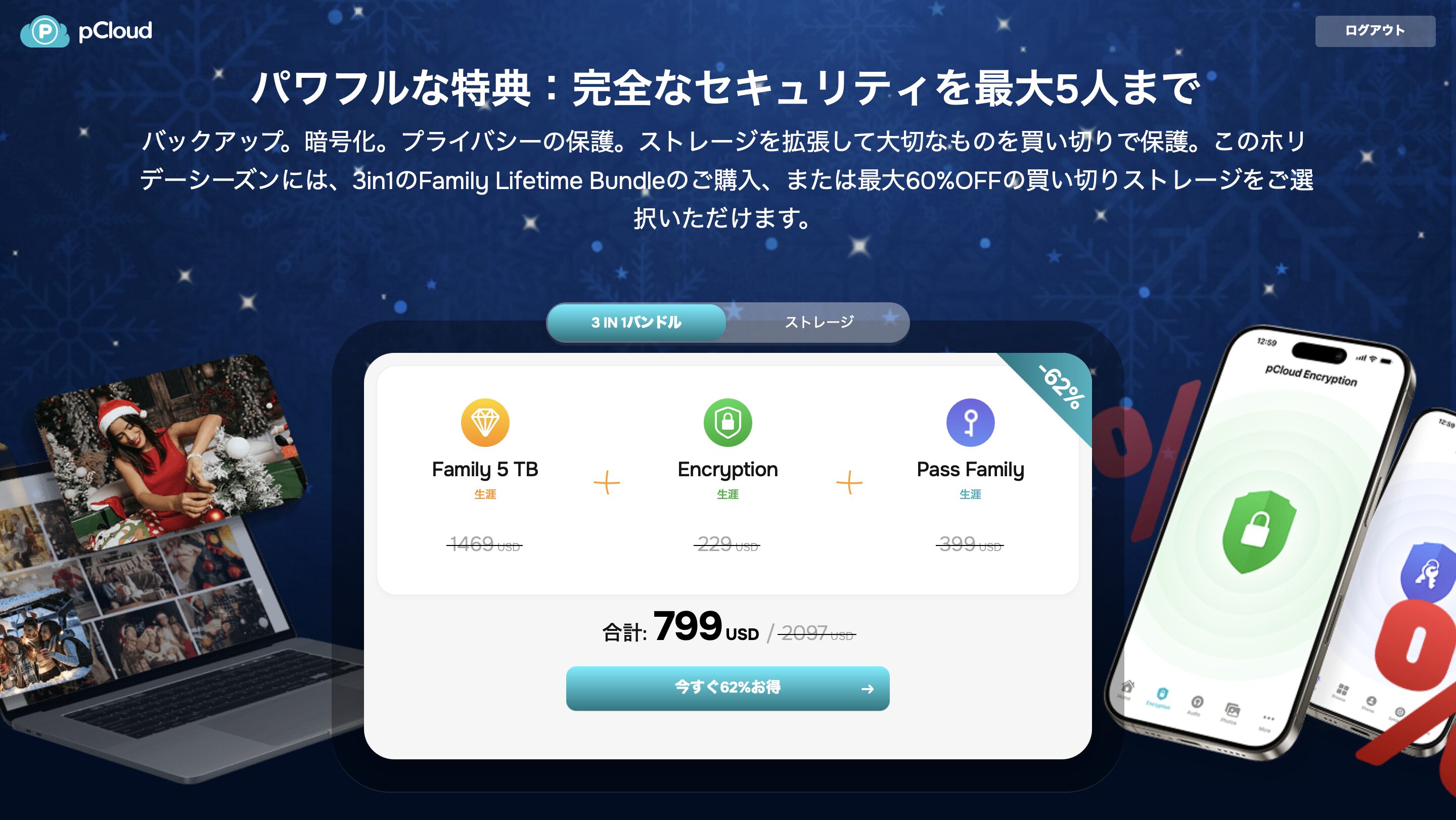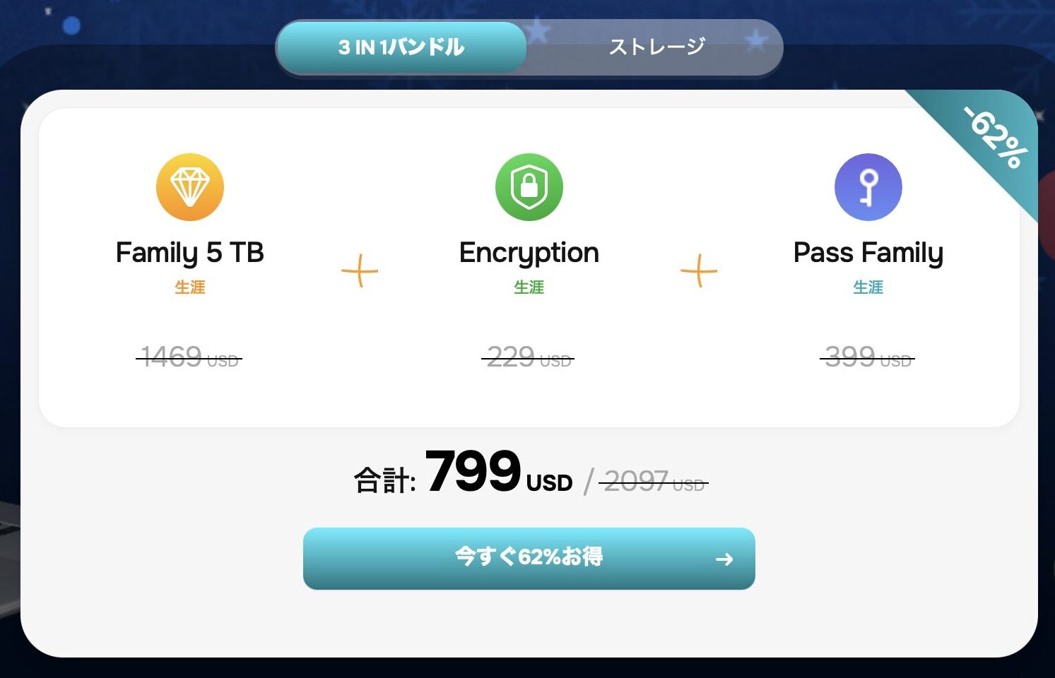 というのも、「3IN1バンドルプラン(pCloudFamily 5TB、pCloud Encryption、pCloud Pass Familyのセット)とpCloudFamily単体プランが超格安で販売されるから」です。