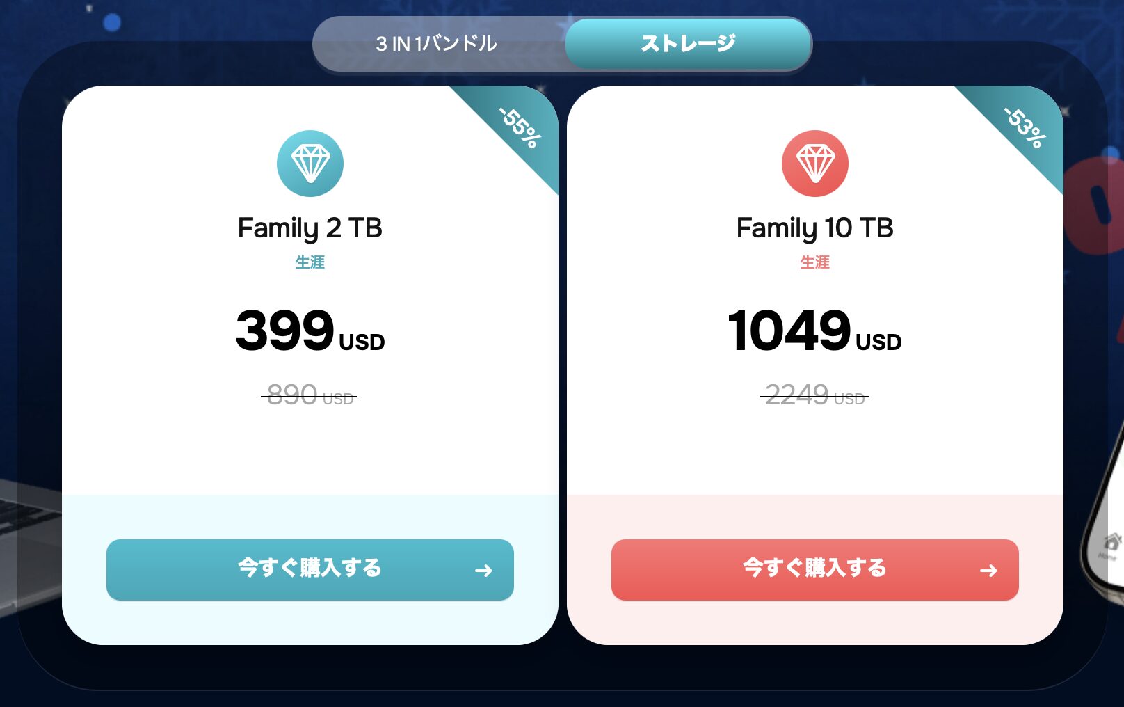 こちらも買い切り方となっており、2TBは890ドルが「399ドル」に、10TBは2,249ドルが「1,049ドル」まで値下げされています。