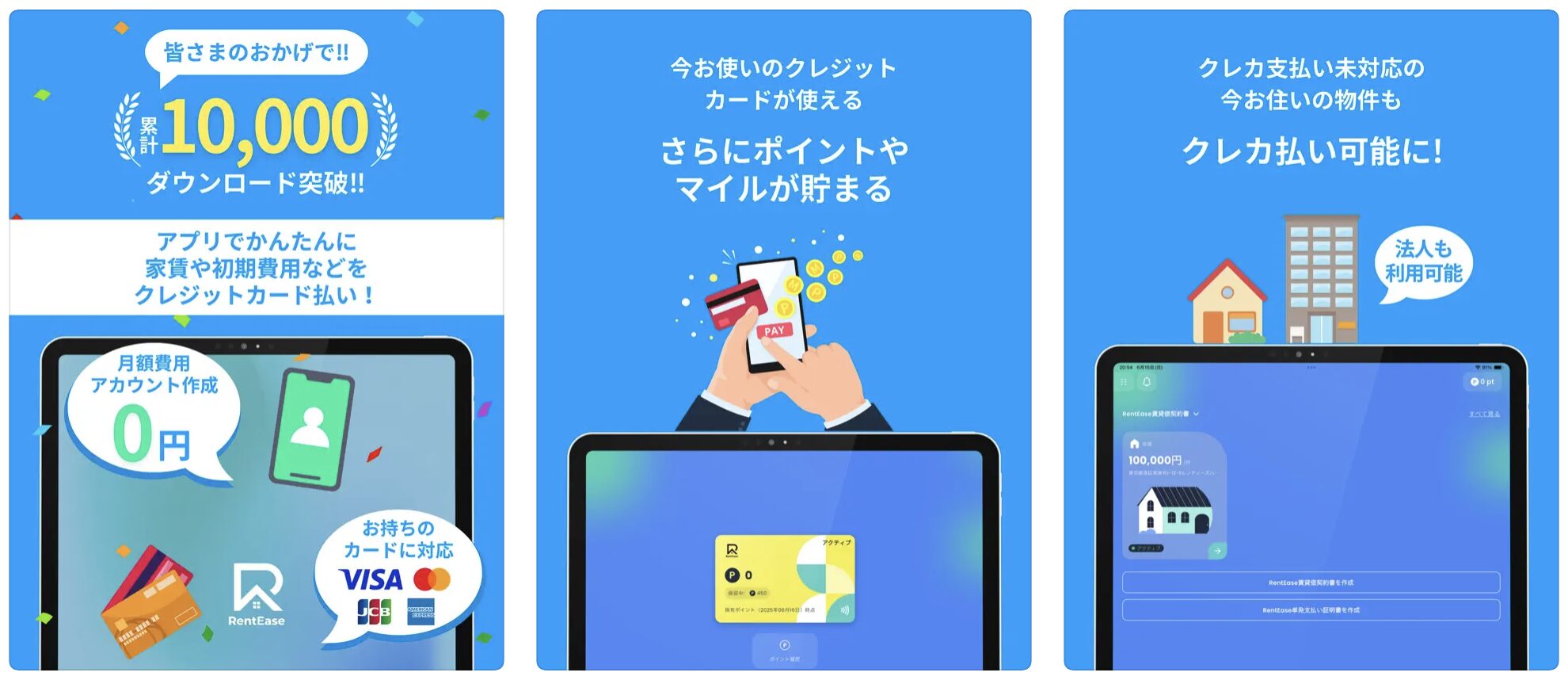 「カードのポイント」と「RentEaseのポイント」両方が貯まるのに、初期費用・月額費用は無料(サービス料は発生)。