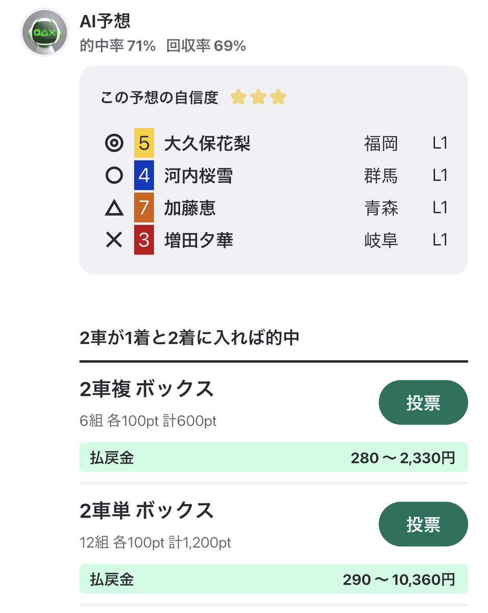 おすすめの投票先を教えてくれるだけでなく、的中率や回収率、予想の自信度、払戻金を示してくれるので、初めて競輪で遊ぶユーザーにとって大きな参考になるでしょう。