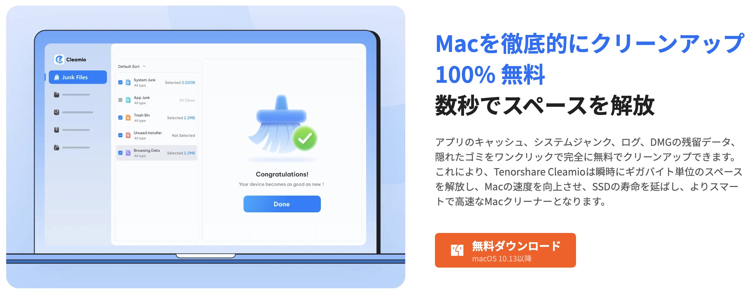 Tenorshare Cleamioとは「Mac内に残留するジャンクファイルやシステムキャッシュ、類似画像などを素早くスキャンし、一括削除できるPCクリーナーソフト」です。