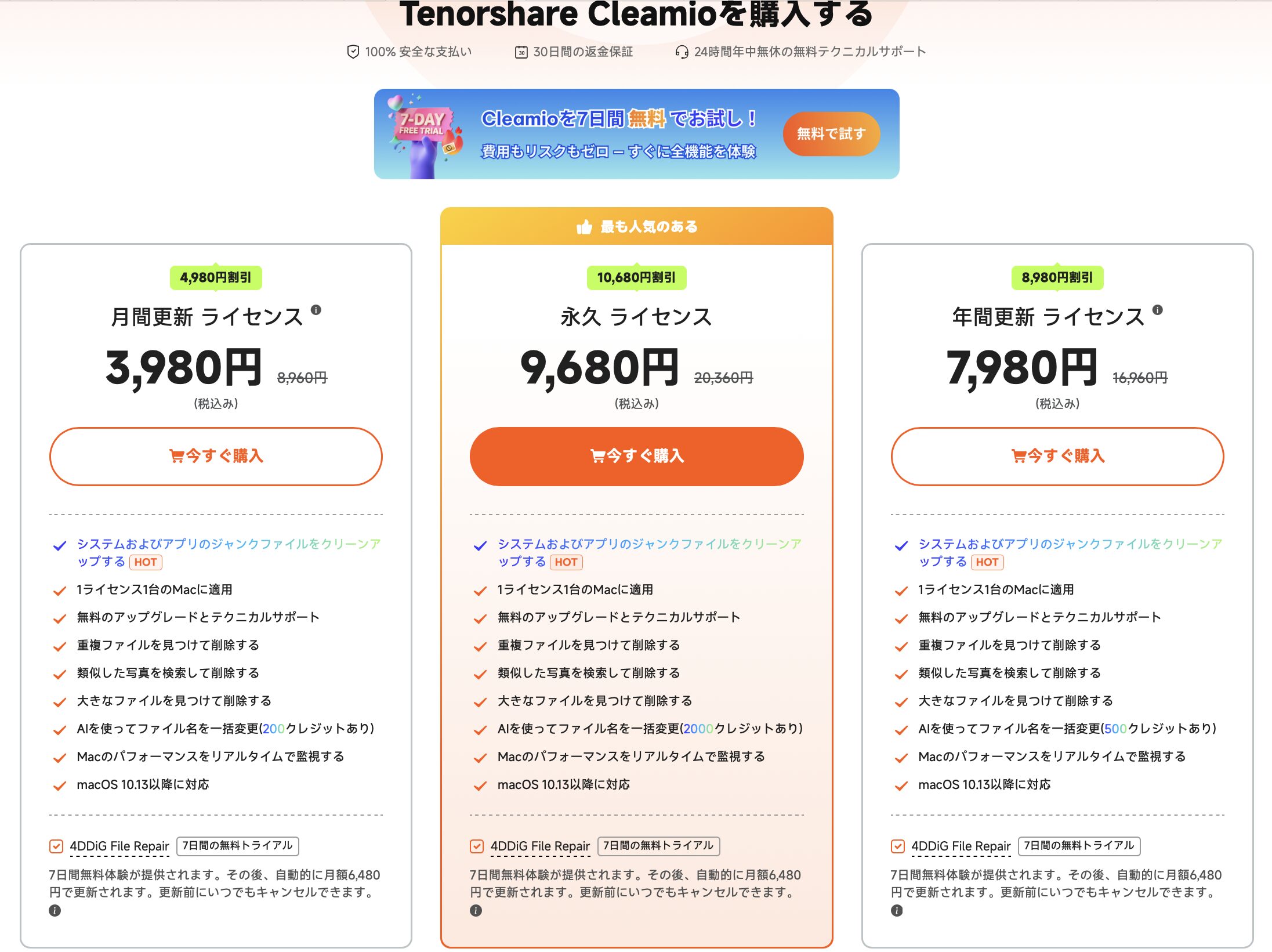 Cleamioは無料でも不要ファイルのスキャンに使えますが、データを一括でクリーンアップするためには有料プランへの加入が必要です。