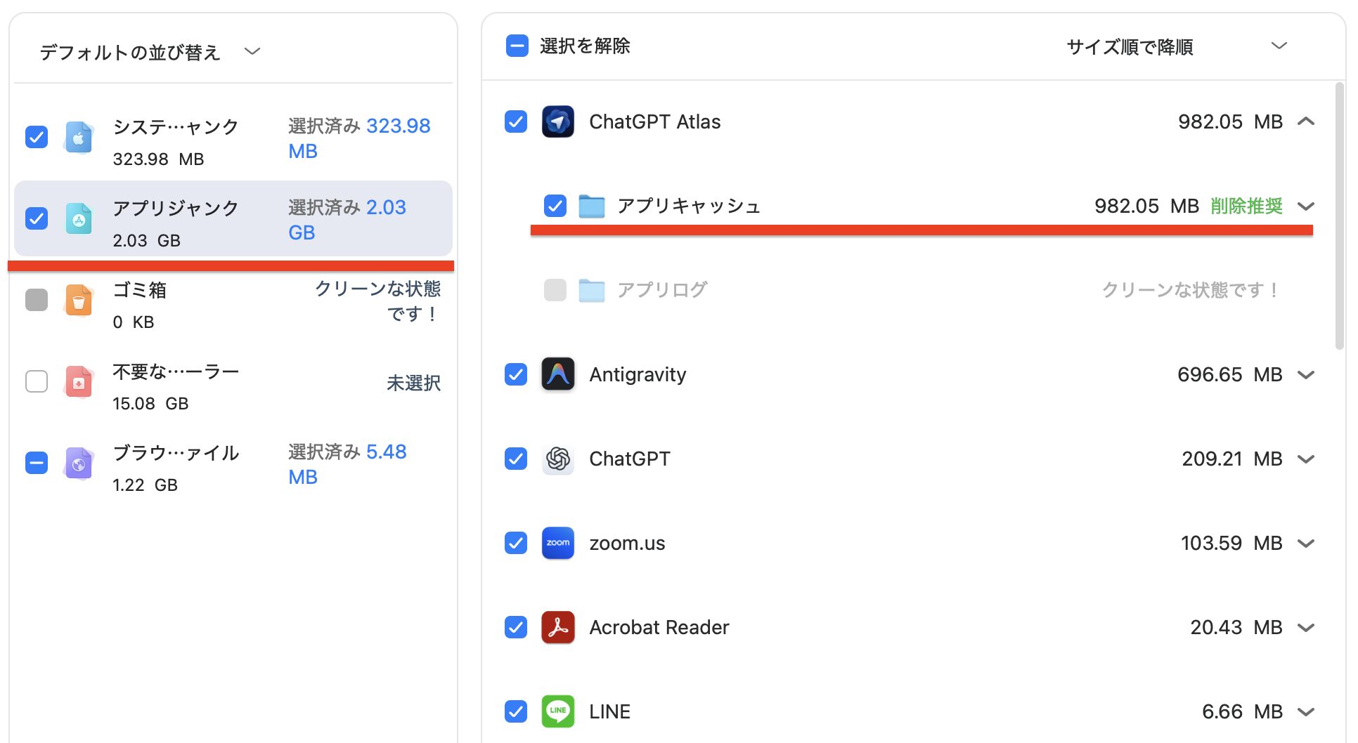 ジャンクファイルやシステムキャッシュ、アプリの残留データをワンクリックで一括削除