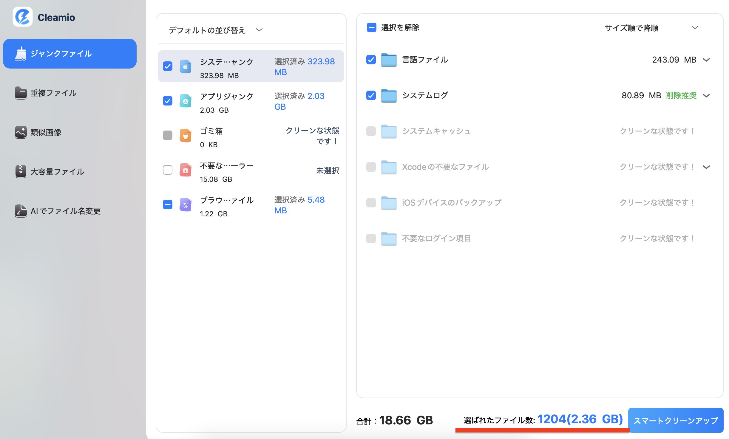 Tenorshare Cleamioであれば勝手に不要ファイルをリストアップしてくれて、Macのパフォーマンスを最適化してくれます。